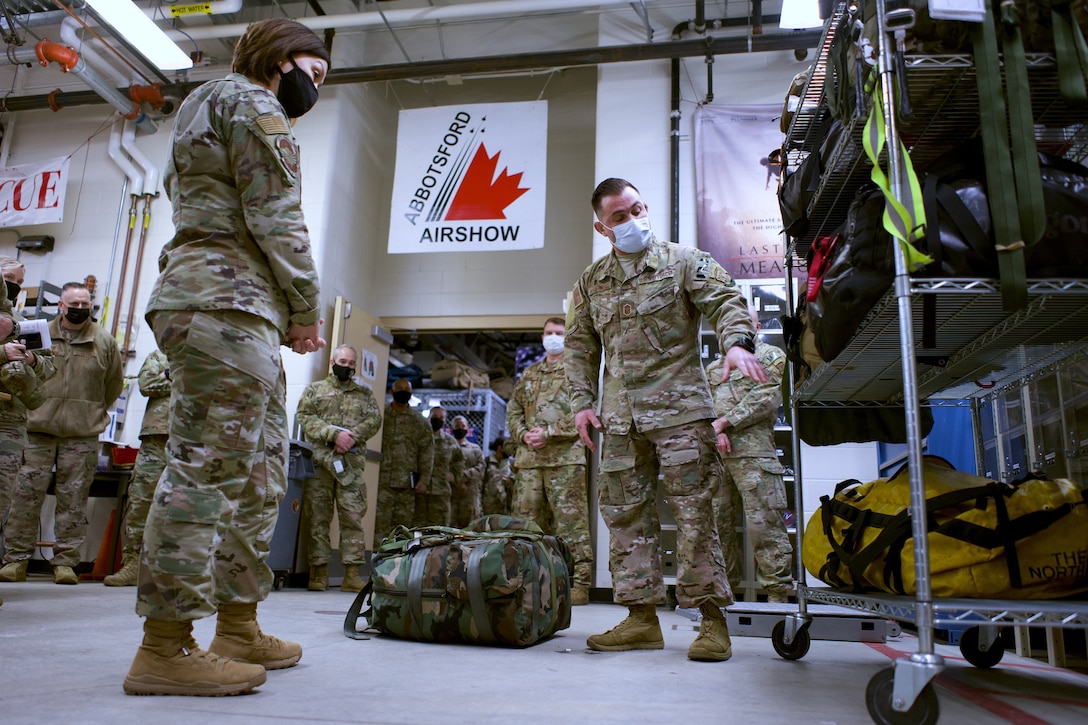 JOINT BASE ELMENDORF-RICHARDSON, Alaska -- Master Sgt. Jeremy Maddama, a 212th Rescue Squadron pararescue (PJ) team leader, shows Chief Master Sgt. of the Air Force JoAnne S. Bass the equipment necessary for arctic pararescue operations Jan. 10, 2022, at Joint Base Elmendorf-Richardson, Alaska. The heavy rucksacks hold equipment necessary for CROs and PJs to conduct search and rescue operations in mountainous terrain under frigid arctic conditions. (U.S. Air National Guard photo by David Bedard)