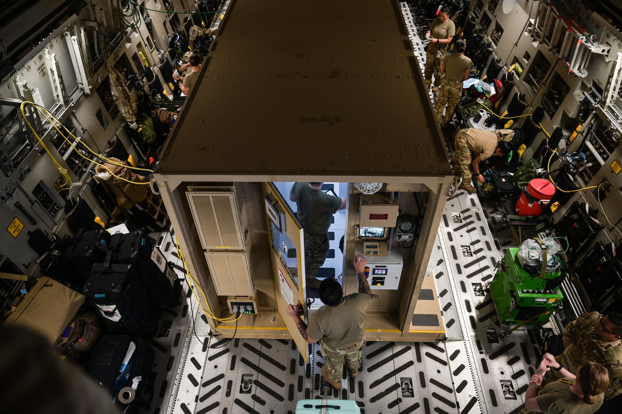 Airmen ready a Negative Pressure Conex-Lite for an infected patient on a C-17 Globemaster III at Joint Base Pearl Harbor-Hickam, Hawaii, Sept. 21, 2022. The NPCL is designed to treat and transport high-consequence infectious disease patients to minimize the risk of contamination and exposure. (U.S. Air Force photo by Staff Sgt. Alan Ricker)