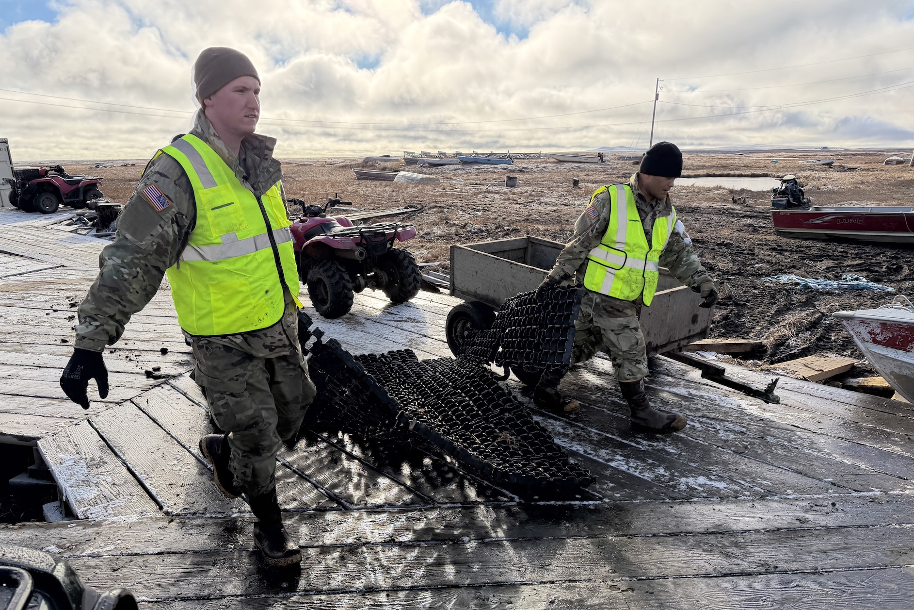Alaska Organized Militia members assigned to Task Force Bethel continue recovery efforts, including retrieving boats the storm washed away and clearing debris at Chefornak, Alaska, Oct. 21, 2025. Small vessels are vital in many affected communities, serving both as essential transportation and harvesting tools. AKOM continues coordinated response operations in support of the State Emergency Operation Center following the 2025 West Coast Storm as the mission focus, pursuant to Governor Dunleavy's declaration of disaster, shifts from lifesaving to life sustainment and stabilization of communities and survivors. (Courtesy photo)