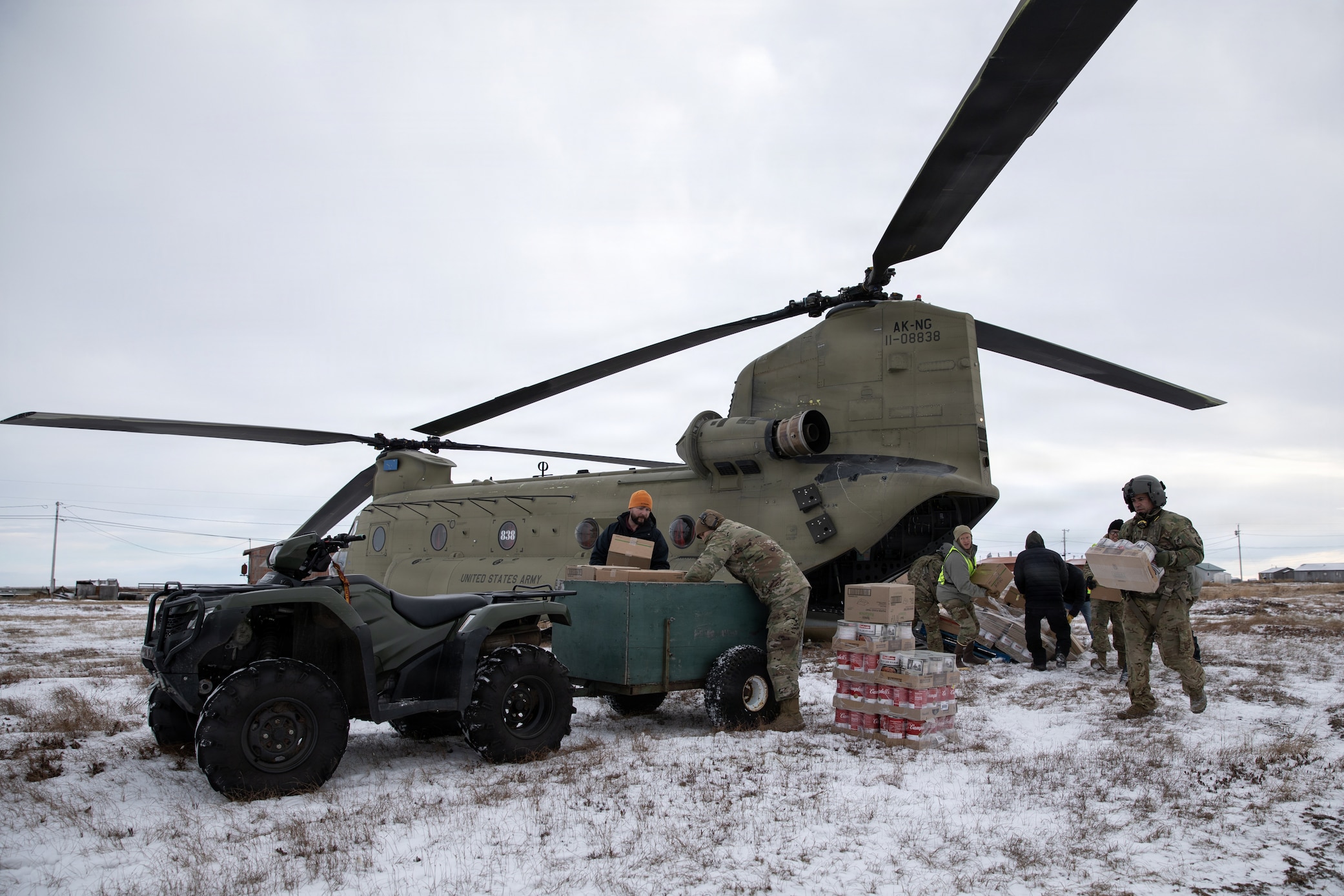 Alaska Organized Militia members, assigned to Task Force Bethel, offload relief supplies from an Alaska Army National Guard CH-47 Chinook helicopter while conducting post-storm recovery efforts for Operation Halong Response at Nunapitchuk, Alaska, Oct. 28, 2025. AKOM members, including Alaska Air and Army National Guardsmen and members of the Alaska Naval Militia and Alaska State Defense Force, continue coordinated response operations in support of the State Emergency Operations Center following Typhoon Halong. (Alaska National Guard photo by Pfc. Azavyon McFarland)