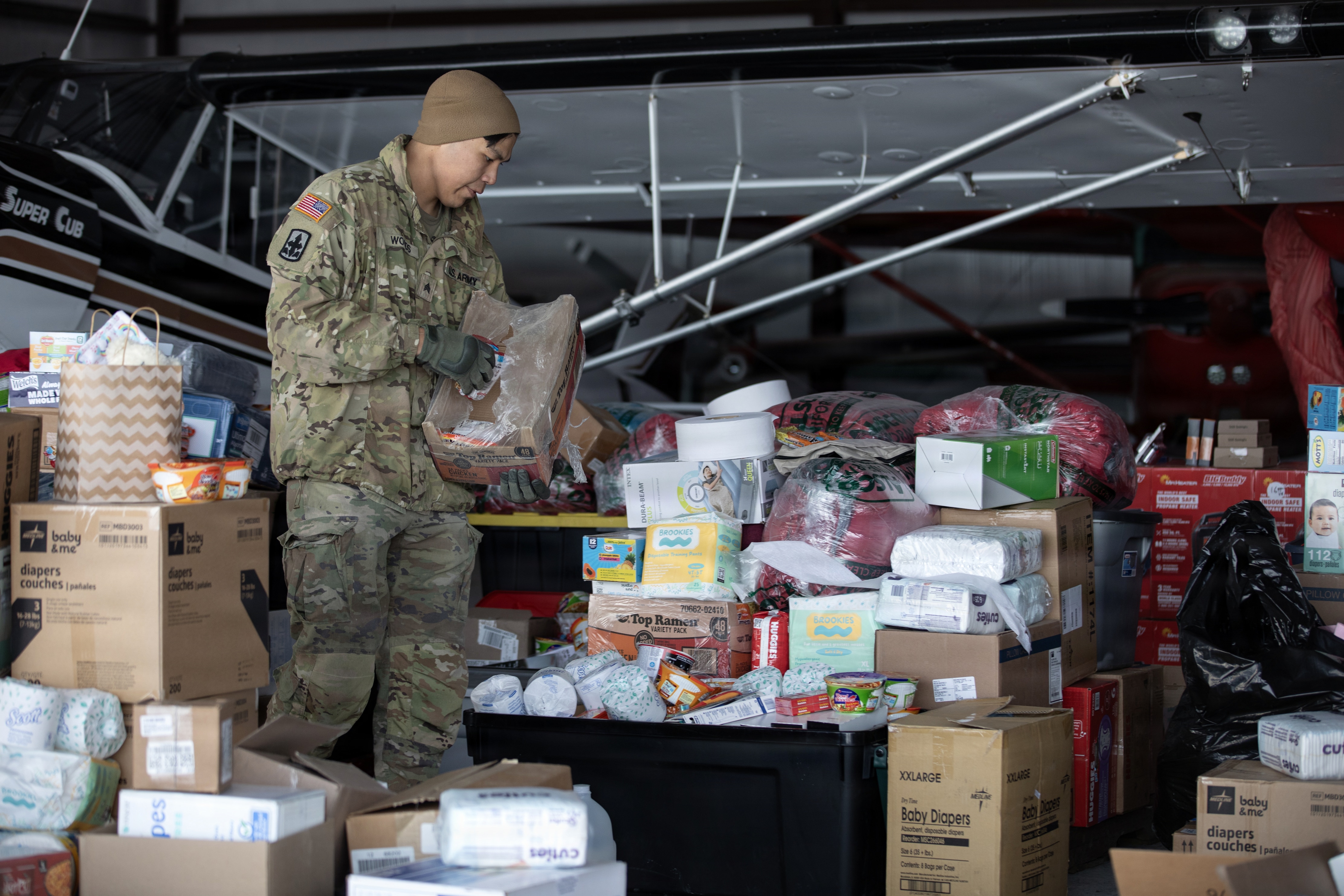 Alaska Organized Militia members, assigned to Task Force Bethel, sort donated relief supplies at the Bethel, Alaska, during post-storm recovery efforts for Operation Halong Response, Oct. 27, 2025. AKOM members, including Alaska Air and Army National Guardsmen and members of the Alaska Naval Militia and Alaska State Defense Force, continue coordinated response operations in support of the State Emergency Operations Center following Typhoon Halong. (Alaska National Guard photo by Pfc. Azavyon McFarland)