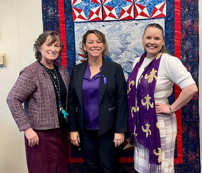 From the left, Alaska National Guard Warrior and Family Services Coordinator Octavia Thompson, AKNG Senior Enlisted Leader Command Sgt. Maj. Julie Small and AKNG Sexual Assault Response Coordinator Ashley Shelton pose for a photo during “Purple Thursday”, a Domestic Violence Awareness Month event Oct. 17, 2024. (Courtesy photo)