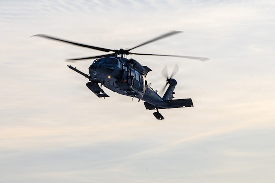 An Alaska Air National Guard HH-60W Jolly Green II helicopter, assigned to the 210th Rescue Squadron, 176th Wing, returns to Joint Base Elmendorf-Richardson, Alaska, after conducting a rescue mission for an injured snowmachiner, Feb. 21, 2026. The mission marked the first time the AKANG used the HH-60W for a rescue. (U.S. Air National Guard photo by Staff Sgt. Joseph Moon)