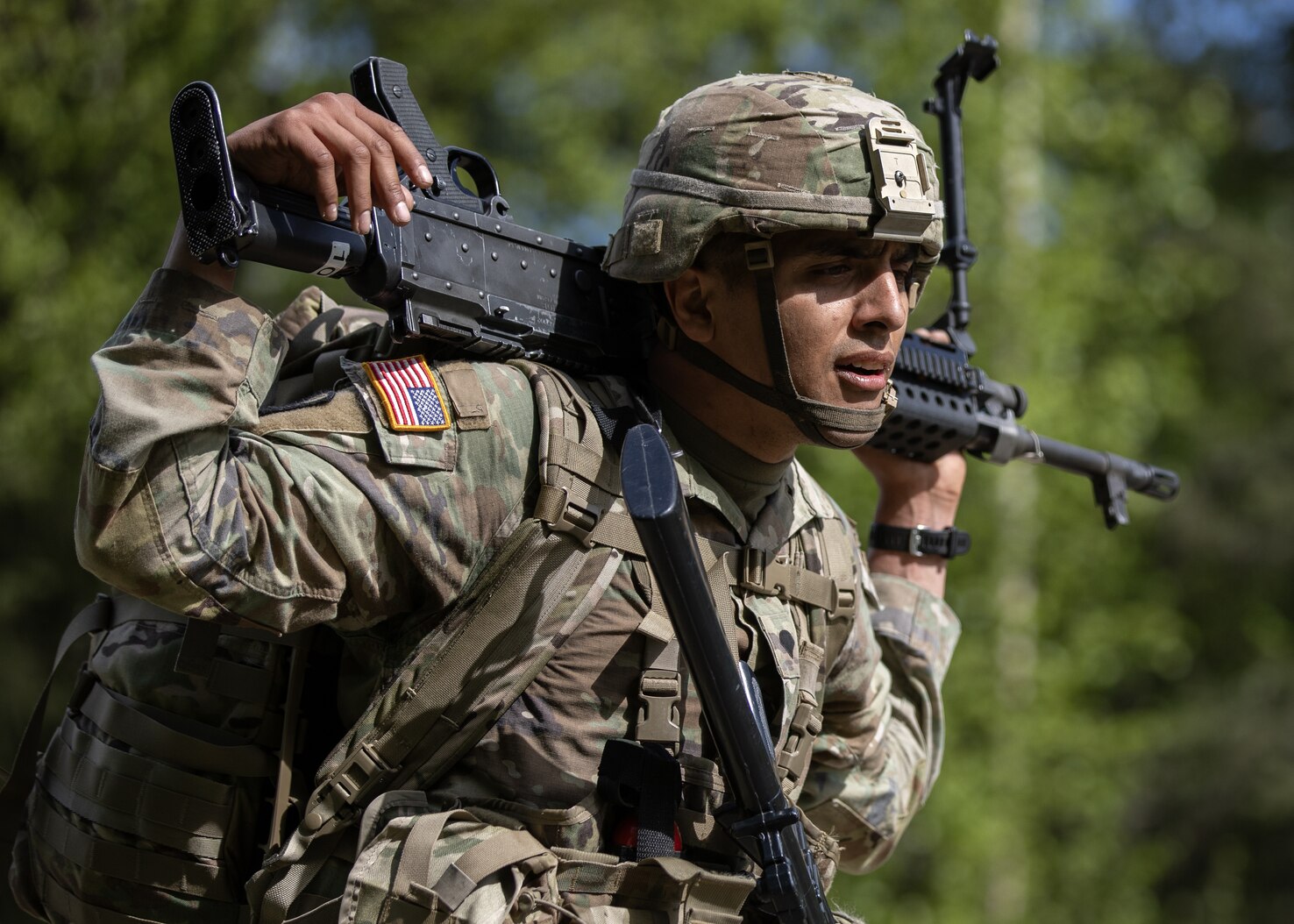 Alaska Army National Guard Spc. Pedro Ochoa, assigned to Alpha Company, 1st Battalion, 297th Infantry Regiment, carries a M240B machine gun while rucking to his objective during the Alaska State Best Warrior Competition 2025 at Camp Carroll on Joint Base Elmendorf-Richardson, May 20, 2025. Hosted by the AKARNG’s 207th Multi-Functional Training Regiment, the SBWC, is an annual, multi-day Soldiering contest that showcases the competitors’ readiness and lethality through a series of challenging mental and physical tests. The events included, a variety of physical fitness tasks, ruck march, land navigation course, live-fire stress shoot, an obstacle course, drill and ceremony, and a uniform inspection. (Alaska National Guard photo by Alejandro Peña)