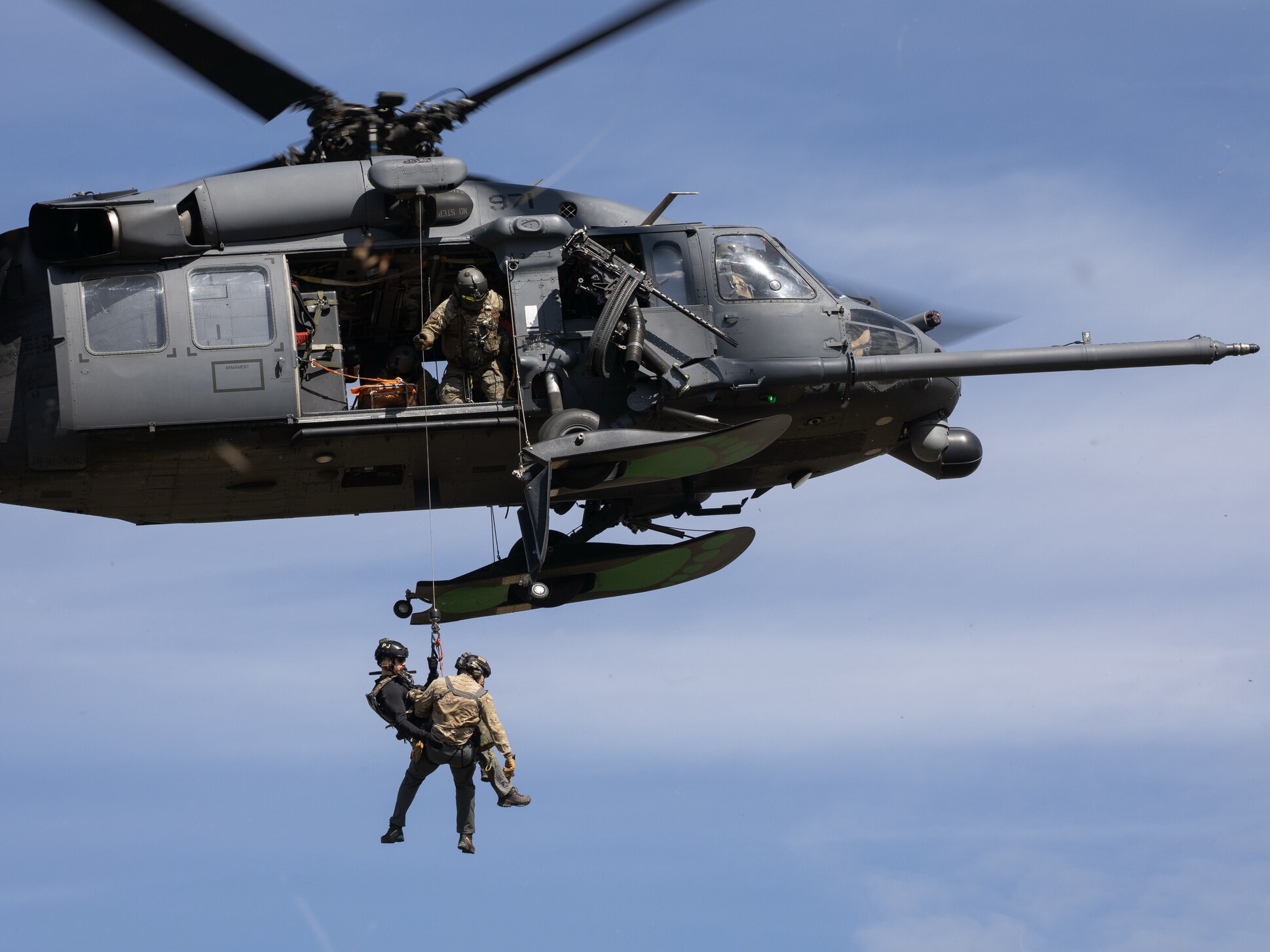Alaska Air National Guard HH-60G Pave Hawk aviators and Guardian Angels, assigned to the 210th and 212th Rescue Squadrons, respectively, conduct a hoist rescue demonstration while participating in a multi-agency hoist symposium at Bryant Army Airfield on Joint Base Elmendorf-Richardson, Alaska, July 22, 2025. The symposium, hosted by Alaska Army National Guard aviators assigned to Golf Company, 2-211th General Support Aviation Battalion, included U.S. Coast Guard crews assigned to Sector Western Alaska and U.S. Arctic out of Air Stations Kodiak and Sitka, Alaska Air National Guardsmen with the 176th Wing rescue squadrons, U.S. Army aviators from Fort Wainwright’s 1-52nd General Support Aviation Battalion, Alaska State Troopers, and civilian search and rescue professional volunteers from the Alaska Mountain Rescue Group. The collaborative training drew on the participants’ varied backgrounds, experiences, and practices, to enhance hoist proficiency and collective readiness when conducting life-saving search and rescue missions in Alaska’s vast and austere terrain. (Alaska Army National Guard photo by Alejandro Peña)