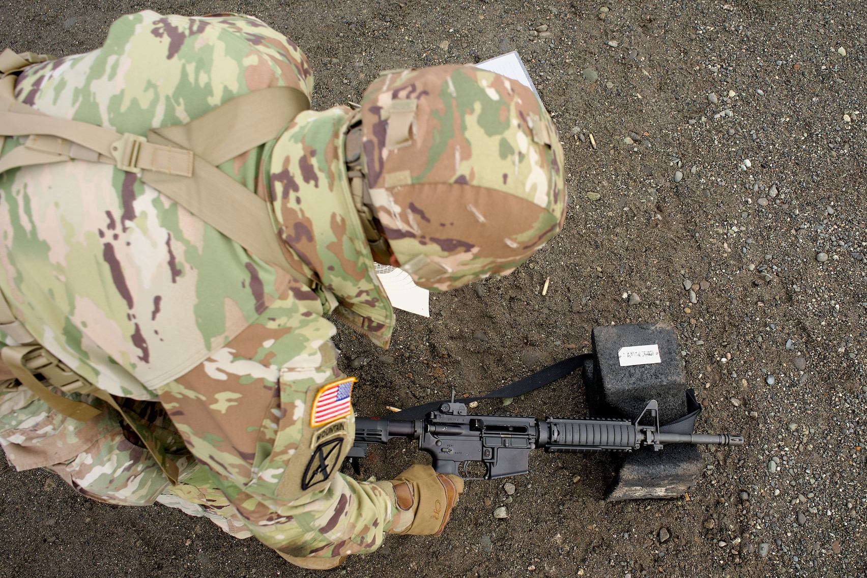 Alaska Army National Guard Sgt. Lee Tobias, 910th Engineer Support Company, recovers his M4 carbine after zeroing the weapon April 11, 2026, at Joint Base Elmendorf-Richardson, Alaska. The company is a vertical and horizontal construction unit. (Alaska National Guard photo by Maj. David Bedard)