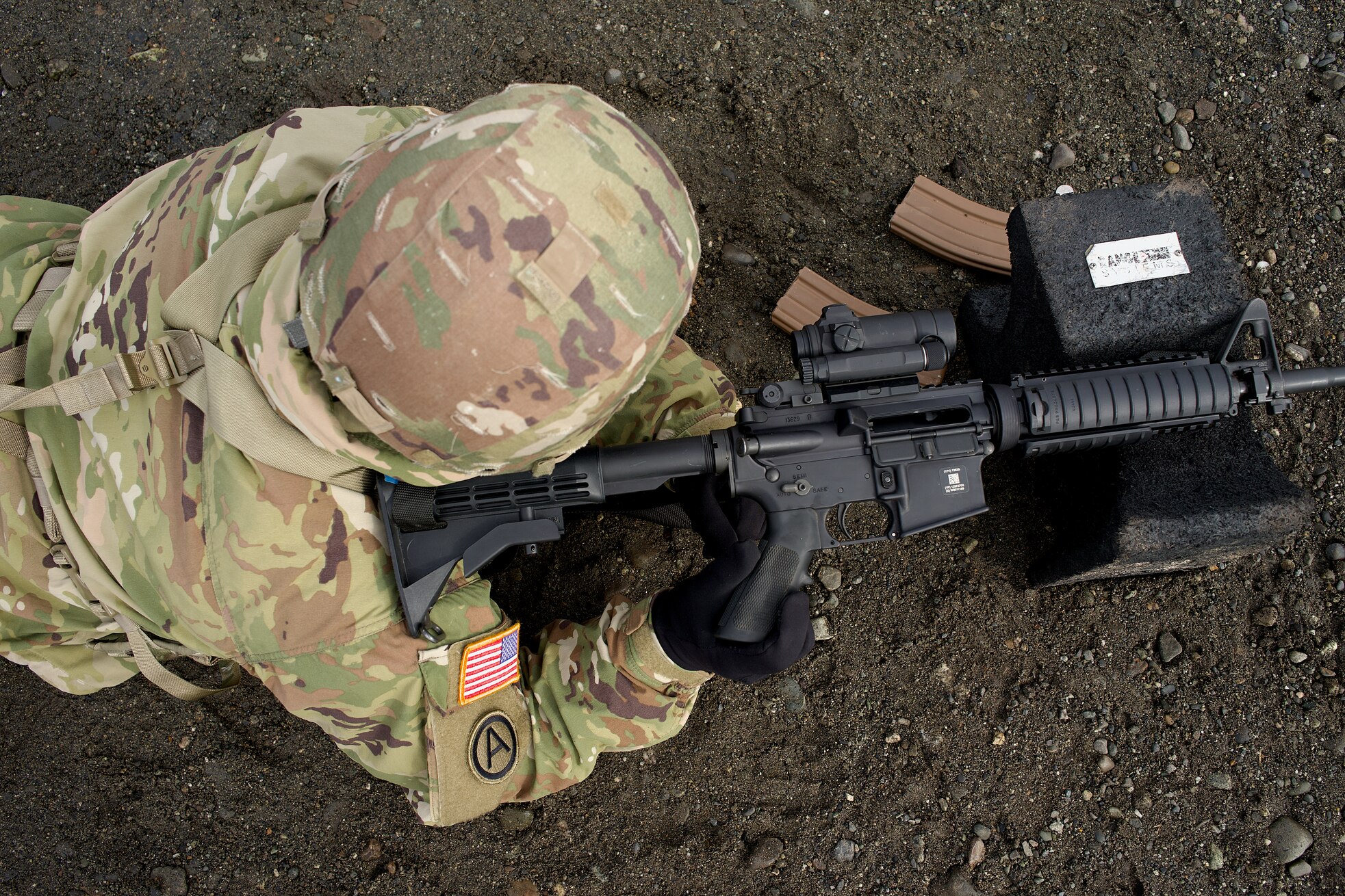 Alaska Army National Guard Staff Sgt. Lester Tuazon, 910th Engineer Support Company, demonstrates his M4 carbine is cleared during range training April 11, 2026, at Joint Base Elmendorf-Richardson, Alaska. The company is a vertical and horizontal construction unit. (Alaska National Guard photo by Maj. David Bedard)