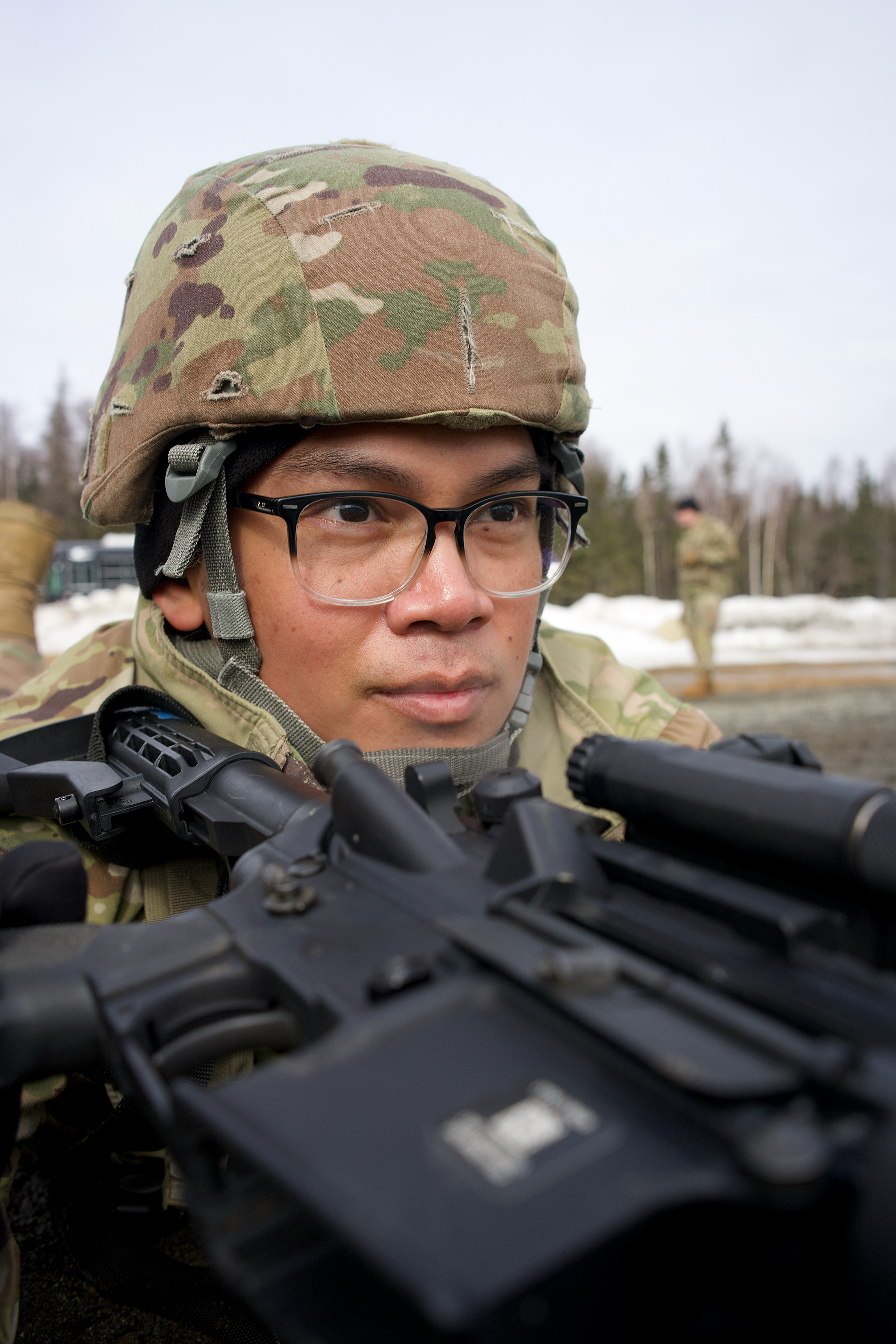 Alaska Army National Guard Staff Sgt. Lester Tuazon, 910th Engineer Support Company, zeroes his M4 carbine April 11, 2026, at Joint Base Elmendorf-Richardson, Alaska. The company is a vertical and horizontal construction unit. (Alaska National Guard photo by Maj. David Bedard)