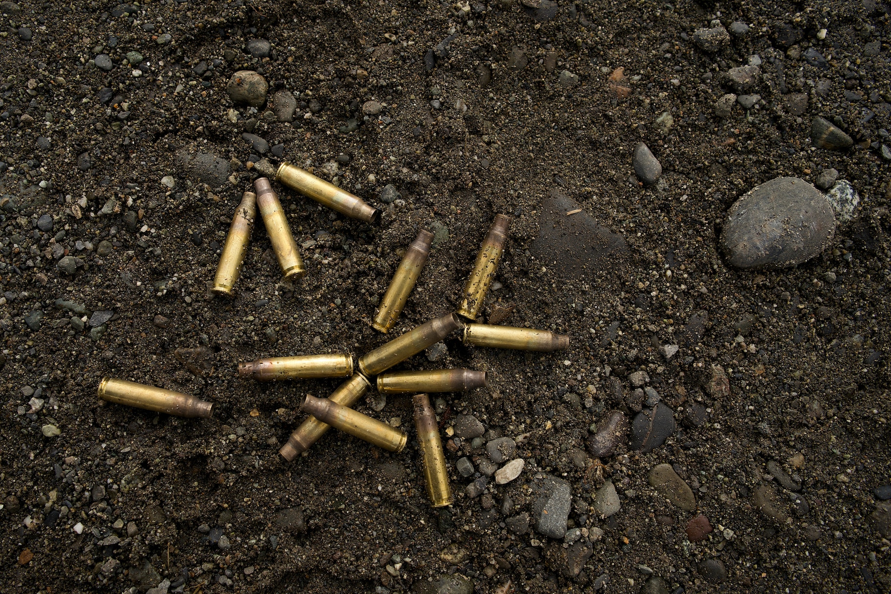 A collection of 5.56-mm cartridges lay at rest during an April 11, 2026, 910th Engineer Support Company training range at Joint Base Elmendorf-Richardson, Alaska. The company is a vertical and horizontal construction unit. (Alaska National Guard photo by Maj. David Bedard)